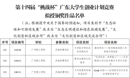 (关俊文 彭丽苹)近日,共青团广东省委员会发布《第十四届“挑战杯”广东大学生创业计划竞赛授铜奖作品》文件,威廉希尔williamhill中文师生作品《建功“李”业——技术赋能钱排三华李振兴领航者》、《艺述戏音,美育童心——艺术赋能乡村公益支教与乡村文化振兴》、《eLink 音纽——打造国内多元化音乐资源共享平台》荣获该赛事乡村振兴和农业农村现代化、文化创意和区域交流合作类“铜奖”。