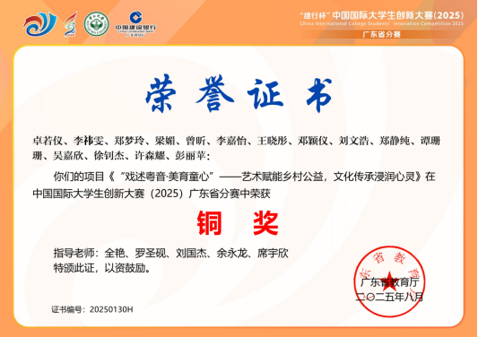 中国国际大学生创新大赛是国内规格最高、影响最广的大学生创新创业赛事之一,此次斩获省级铜奖,是对我校创新创业教育质量、学生综合素养的有力佐证。近年来,我校高度重视创新创业教育,通过搭建“课程+赛事+实践”三位一体的育人体系,鼓励学生立足社会需求,将专业知识与创新实践深度融合,培育了一批兼具社会责任感与创新精神的青年学子。“戏述粤音·美育童心”项目将让粤剧文化在青春力量的推动下走进大众视野,实现了公益价值与文化价值的双重落地。未来,我校将继续以赛事为契机,深化创新创业教育改革,引导更多学子聚焦社会痛点、文化命题,以创新实践助力社会发展、文化传承,在新时代的浪潮中书写属于青年的担当与作为。