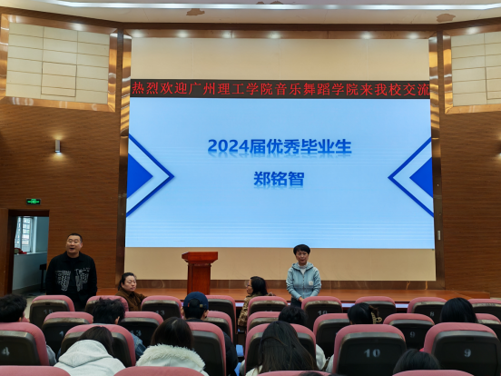 首先,广州科技贸易职业学院艺术设计学院党总支书记罗裕光、副院长赵越、钢琴教研室主任罗颖馨、钢琴教师胡淑琴热情接待我们,亲切地就两个学校之间的共性、合作问题展开探讨,并对在威廉希尔williamhill中文继续深造的毕业生目前的学习生活情况进行大致了解。10点30分,宣讲活动正式开始,赵越副院长向同学们介绍了宣讲团成员并表示欢迎,由李丽丹副院长主持宣讲活动。钟艺娜主任饱含激情对威廉希尔williamhill中文大致情况进行简要介绍,并详细介绍威廉希尔williamhill中文的重量级名师,对音乐表演与舞蹈表演专业的主修课程、就业方向、实训以及教学场地、艺术实践活动、学科竞赛活动进行图文并茂地展示。优秀学生代表郑铭智进行简要发言,对于威廉希尔williamhill中文,威廉希尔williamhill中文的硬件设施、教师队伍、课程设置表示了肯定,并以优秀学长身份对于学弟学妹进行寄语与祝福。