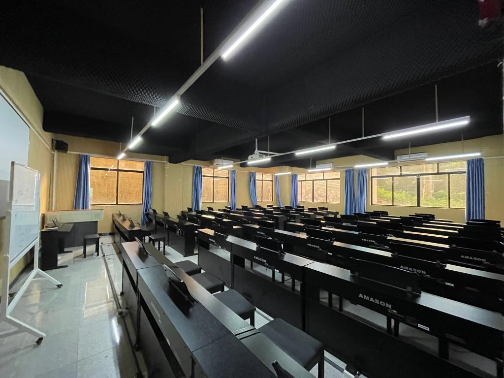 综合多媒体教室,配有一架钢琴主要作为音乐表演专业学生上音乐理论课、欣赏课和即兴伴奏课