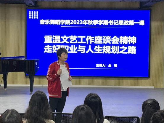 课上,丁义院长以“民歌之美”为主题并结合声情并茂的示例演唱,向学生讲述了民歌的发展和特点,让同学们了解到民族音乐之美不仅体现在它的音乐艺术表现形式和独特的音乐韵律上,更体现在其悠久的历史和丰富的文化内涵上。全艳副书记结合文艺工作座谈会精神,引导同学们思考个人职业规划和人生发展方向,应当将文艺工作座谈会精神融入到职业与人生规划中,培养正确的价值观、关注社会现实、坚持创新创造、追求高尚人格和践行社会主义核心价值观,更好地实现个人价值和社会发展的有机统一。