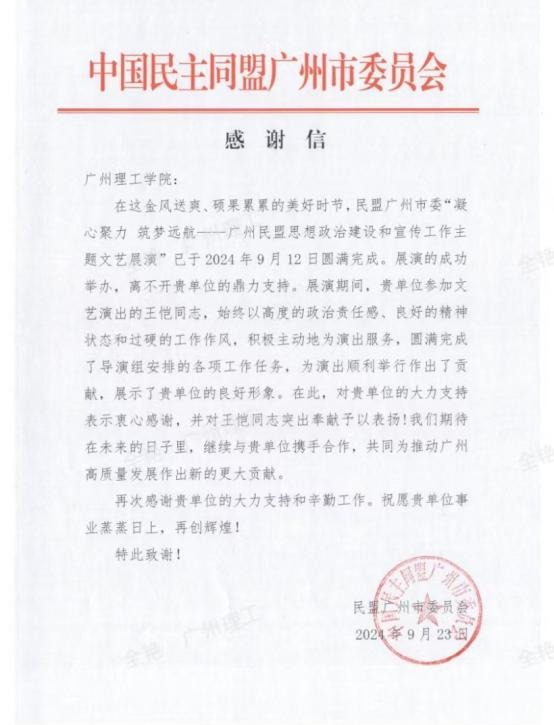 近日,我校收到了民盟广州市委员会发来的感谢信,对我校威廉希尔williamhill中文王恺副院长在文艺展演中的贡献表示感谢。9月12日,由民盟广州市委员会、广州市文化广电旅游局联合主办的“凝心聚力 筑梦远航——广州民盟思想政治建设和宣传工作主题文艺展演”在广州市文化馆举行。王恺副院长参演了此次展演,展现了高水平的专业素养,获得了广州民盟的高度赞扬和诚挚感谢。