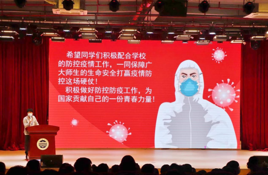 全艳副书记对省市级及学校参照广州卫健委防疫要求做出的疫情防控工作总体要求向同学们进行了传达并作出总体部署。全书记分析了当前疫情的防控形势,近期国内多地发生聚集性疫情,省内传播风险相对增高,大疫情防控严峻、防控压力徒增,面对即将到来的清明假期,重点强调了非必要不离校、非必要不出市,并说明了离校离市的请假范围及要求,离校以后的防护措施以及所需承担的风险。她指出全校上下要严格落实广州市发布的29、30号通告,要全面进行落实省市和学校关于疫情防控工作的部署和要求,从严、细、实、快地做好各项工作。禁止学生抱侥幸心理和持松劲心态,大家都应自觉履行相关程序,尽好自己应尽的义务,学校将严格查处隐瞒和谎报实际情况以及未请假擅自离校等违纪行为。同时全书记对网络上的一些舆论进行了回应,表示网络并非法外之地,每一位同学要对自己的一言一行负责,做到不造谣不信谣不传谣。会议最后全书记对现场学生提出的问题进行了一一解答。