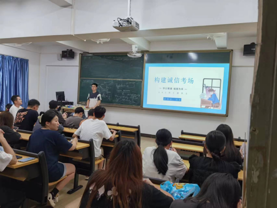 主题班会上,各班班导师强调诚信的重要性:诚信是公民的第二个“身份证”,是日常行为的诚实和正式交流的信用的合称,待人处事真诚、老实、讲信誉,言必信、行必果,一言九鼎,一诺千金。班导师指出,考试是一种严格的知识水平鉴定方法。为了保证结果的公平,考场必须要求有很强的纪律约束。希望同学们发扬良好的班风,树立起一面积极向上的旗帜;人人都能学有所用,学有所长,把道德原则和道德规范内化为自己的内心信念,外化为自己的实际行动,以纯洁的心灵吸纳无尽的知识,远离校园考试舞弊,做一个诚实自信而又有活力的大学生。最后,各班组织学习《学生手册》考场规则、学生考试违规认定与处理办法,从学校制度层面强化对学生诚信考试教育。