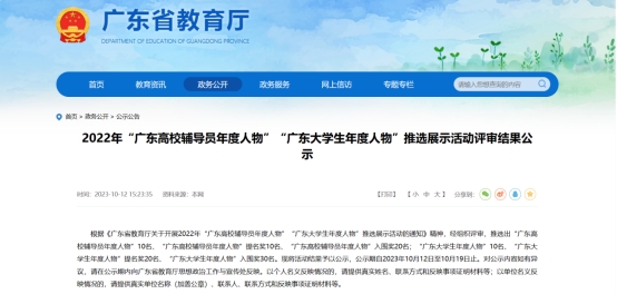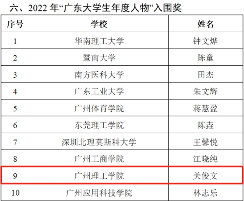 近日,广东省教育厅公布2022年“广东大学生年度人物”推选展示活动结果公示,威廉希尔williamhill中文20音表5班(Z)关俊文同学荣获2022年度“大学生年度人物”入围奖(序号9)。2022年“广东大学生年度人物”推选展示活动是由广东省教育厅主办,旨在深入学习贯彻习近平总书记关于高校思想政治工作的重要论述,大力选树新时代大学生先进榜样,充分展示高校大学生群体昂扬向上的精神风貌,培养堪当民族复兴重任的时代新人。此次活动共推选出“广东大学生年度人物”10名、“广东大学生年度人物”提名奖20名、“广东大学生年度人物”入围奖30名。
