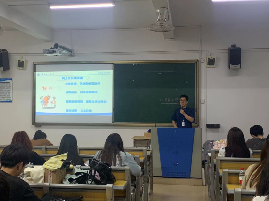 主题班会上,各班通过公式揭示电信网络诈骗的真相,所有无法准确确认身份的人物,利用电话网络短信等见不到真人的沟通工具,要求转账、汇款,即为诈骗,并且详细分析了网络购物类诈骗、冒充客服类诈骗、刷单兼职类诈骗、冒充公检法诈骗、网上交友类诈骗等常见的校园电信网络诈骗类型,梳理电信网络诈骗的共同规律,揭示常见的电信诈骗手段和方式,引导学生保存保卫处及太和派出所电话,如遇诈骗,及时补救。最后,各班级组织观看学院学生自制防诈骗视频。