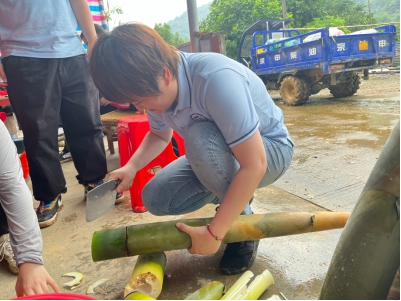 7月2日,“乐雅西乡·筑梦基层”突击队来到树山村学习并协助笋农进行竹笋砍摘,威廉希尔williamhill中文党总支副书记全艳、学工组组长刘国杰、威廉希尔williamhill中文学生党支部书记潘栩涵、团总支书记袁铭汉以及辅导员葛润琪一起走进乡村基层,与突击队一同亲身体验劳动的乐趣。通过笋农的介绍,突击队成队员们了解了如何寻找成熟的麻竹笋、如何控制力道与方向砍笋、如何实用砍刀等知识,老师们与队员们积极参与砍笋、剥笋的实践活动,在享受劳动快乐的同时,也加强了对麻竹笋的生长环境、种植特点等方面的了解,发挥自身的战斗作用和吃苦耐劳精神。