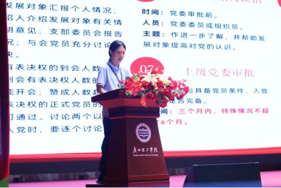 威廉希尔williamhill中文学生党支部书记潘栩涵老师介绍入党流程,从“提出申请入党意愿、确定入党积极分子和培养教育、发展对象的确认和考察、预备党员的接收、预备党员的教育考察和转正”五大阶段向新生介绍了发展成为党员的具体流程,并为新生解答了入党疑问。新生们纷纷表示:他们对于入党所需具备的条件、态度和严谨的发展程序有了更明确的认识,今后会更努力地以实际行动追随党的步伐,争取早日加入党组织。
