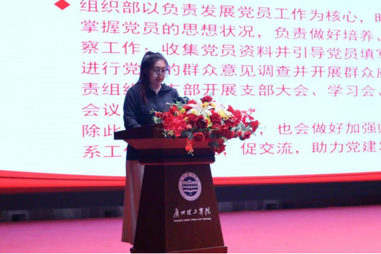 大会开始,威廉希尔williamhill中文学生党支部副书记伍伟慧同志分别介绍了学院党组织的四个部门,分别为组织部、纪检部、统战部和宣传部,并介绍了每个部门的职责范围,让新生更加了解党支部的职责要求,增强新生的使命感,鼓励新生积极加入党组织的建设工作中。