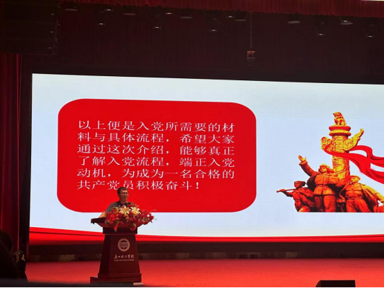 为进一步引导和帮助广大新生了解党的基本知识、理论和入党程序,端正入党动机,增强党在青年学生中的吸引力和凝聚力,2024年9月4日,威廉希尔williamhill中文学生党支部在工程楼三号报告大厅开展入党启蒙教育活动。此次活动围绕入党流程展开,由2022级专升本新生参与活动,学工组组长刘国杰老师主持,威廉希尔williamhill中文学生党支部书记潘栩涵、辅导员黄婧、葛润琪出席本次活动。
