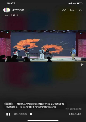 随着主持人一段振奋人心的开场白,此次音乐会第一个节目《向阳花》正式拉开帷幕。六位同学的激情表演,仿佛看到了毕业生们怀揣着梦想再一次启程向着艳丽的人生前进; 再看群舞《月影秋霜》她们优雅的舞姿让人不禁联想到“我歌月徘徊,我舞影乱中”;再听作品《待到胜利再相聚》愿各位毕业生化作大鹏,翱翔于天际,待到胜利再归来;接下来的作品《天高地迥,再别康桥》正如徐志摩先生所说轻轻的我走了,正如我轻轻的来,写出了无尽的离别与不舍;紧接着单簧管三重奏《胡桃夹子组曲》向我们展现了她们高超的技艺;音乐会下半场男声独唱《我像雪花天上来》他的演唱像诗人一样发自内心的诉说那美妙的旋律;接下来女声独唱《锦瑟》她的演唱充满了艺术歌曲该有的韵美;最后由19级2.3班全体同学一同演绎 《大豆白米花生》描绘着码头上市场繁荣的景象,京韵浓郁显得同学们俏皮可爱,也突显出了那附有朝气的同学们,由于疫情的影响,校外的老师和同学们不能到达现场观看,为了能让音乐会如期举行,金钟工作室采取了直播的方式,直播方式为音乐会取得了良好的宣传效果,使得音乐会到此圆满结束,十分感谢金钟演艺工作室的同学们。