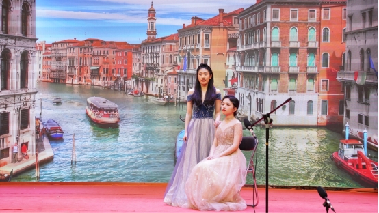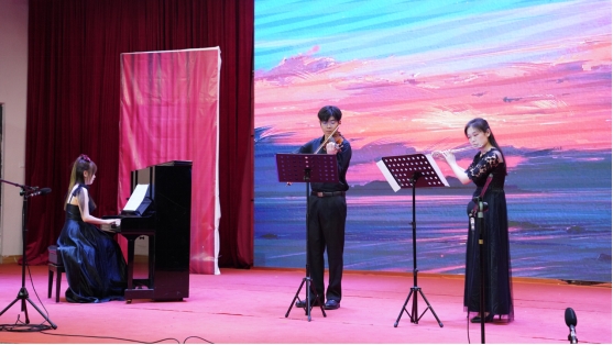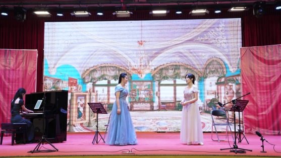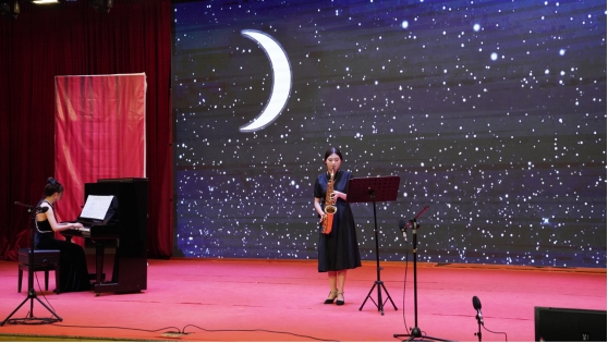 伴随着主持人声情并茂的开场白,音乐会就此拉开了帷幕。随着灯光亮起,音乐会以由谢依晨同学钢琴伴奏,贺雨涵同学和何慈庆同学演奏的长笛与小提琴二重奏法国香颂《爱的礼赞》作为开场拉开序幕。长笛的音色更加清澈、开朗和统一,而小提琴的音色更加浑厚、含蓄和富于变化,我们欣赏到了长笛和小提琴相互配合交替演奏主旋律。接下来由方楠同学钢琴伴奏,张韵彤同学和林雨霞同学演唱的女声二重唱,莫扎特作品《啊你瞧呀妹妹》。接下来是由伍雪莹同学钢琴伴奏,钟欢同学和张馨竹同学演唱的女声二重唱,选自奥芬巴赫的歌剧《霍夫曼的故事》中的《船歌》。女高音与次女高音旋律相互交织,最后合在一起,渐轻地结束,好似小船已划向远方,歌声逐渐消失在夜空中。紧接着由吴怡俏同学钢琴伴奏,唐心怡同学演奏的萨克斯独奏《高雅的妇人》,音量把控合适,具有歌唱性且柔和优美音色的特点,演奏极具表现力。最后一首歌是蔡汶佐钢琴伴奏,陈榆昆同学演唱的《爱永在》,男高音的张力使得本场音乐会的氛围达到顶峰。随着最后一首歌的收尾,本次音乐会圆满结束。