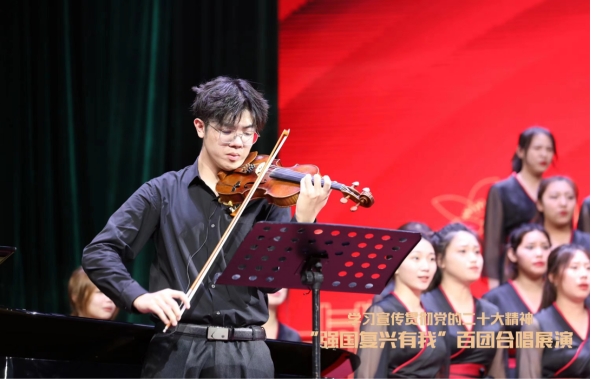 《月半小夜曲》是向雪怀填词,由河合奈保子作曲,李克勤演唱的一首歌曲,改编为广为流传且非常经典的粤语金曲,这次展演其中的小提琴也是让人耳目一新。而另一首作品《广府情》是以广州歌手东山少爷所演唱的《西关小姐》为主线的歌曲,曲中还糅合了广东人耳熟能详的经典名曲、童谣。其中包括《月光光》《外来媳妇本地郎》《彩云追月》,使用阿卡贝拉的无伴奏的形式所演唱。两首都是极具广东音乐特色的粤语合唱作品。我校合唱团在舞台上的气势鼓舞人心,歌声热烈磅礴,展现了我校新时代青年的奋进拼搏精神。