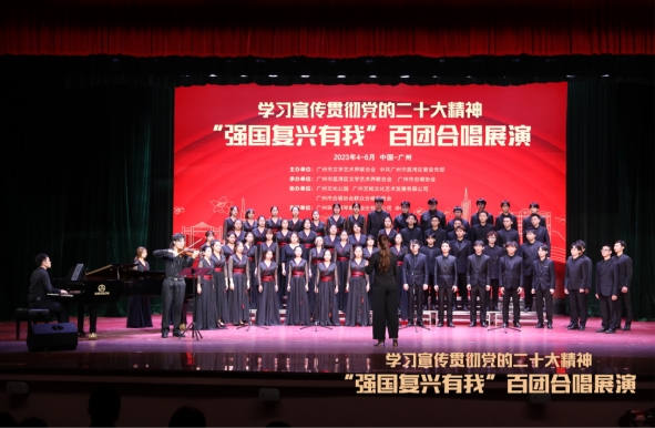 为深入贯彻党的二十大精神,全面推进素质教育,丰富校园艺术文化生活,威廉希尔williamhill中文合唱团受邀参加由广州市文学艺术界联合会、中共广州市荔湾区委宣传部主办,广州市荔湾区文学艺术界联合会、广州市合唱协会承办的《学习宣传贯彻党的二十大精神——“强国复兴有我”百团合唱展演》,展演于2023年6月11日晚七点在广州文化公园中心台举行。我校合唱团在此次学习宣传党的二十大精神“强国复兴有我”百团合唱展演中,选唱了《广府情》、《月半小夜曲》两支粤语歌曲。