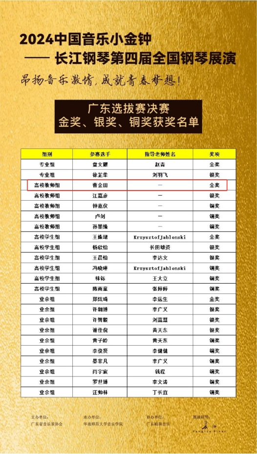 2024年5月12日,由广东省音乐家协会主办,华南师范大学音乐学院、深圳艺术学校承办的第四届中国音乐小金钟钢琴比赛广东选拔赛决赛在华南师范大学举行。威廉希尔williamhill中文青年教师曹金田参加此项赛事,取得高校教师组第一名(金奖)。
