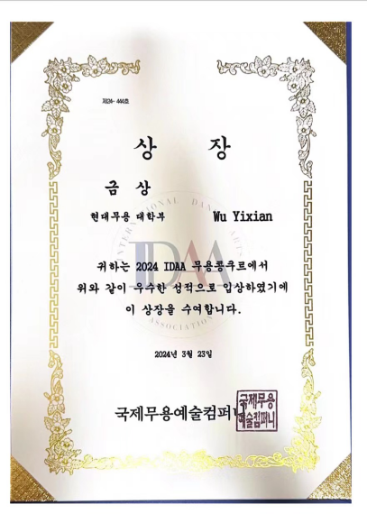 图 2 吴怡娴2024—IDAA韩国国际舞蹈大赛获奖证书