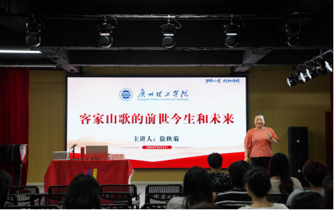 在讲座过程中,徐秋菊老师为了更直观的让在场观众了解到客家山歌的种类,还现场献唱了多首经典客家山歌。她的歌声婉转悠扬,情感真挚动人,深深打动了在场的每一位听众。师生们纷纷表示,通过徐老师的演唱,他们更加直观地感受到了客家山歌的韵味和魅力。