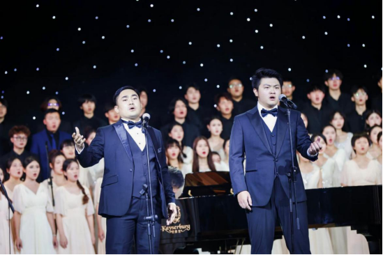 张继薪老师富有激情的朗诵,黎艺斌、姜维两位老师的技艺精湛的双钢琴伴奏,把观众带入黄河精神的氛围,第一乐章《黄河船夫曲》以其粗犷有力的旋律和激昂的节奏,瞬间点燃了现场观众的热情。潘梓健老师演唱的《黄河颂》以其深情而庄严的歌声,颂扬了黄河作为中华民族母亲河的伟大与崇高。混声合唱《黄水谣》则以温婉细腻的旋律,展现了黄河儿女对家乡的深深眷恋。同学们们用她们那清澈而富有穿透力的声音,将歌曲中的情感表达得细腻入微,令人陶醉其中。紧接着,张智、周凌志老师领唱的《河边对口曲》以其独特的艺术形式和生动的表现力,将黄河岸边人民的生活场景生动地呈现在观众面前。李丽丹老师演唱的《黄河怨》将歌曲中的悲愤与无奈表达得淋漓尽致,让人感受到了黄河儿女在苦难中不屈不挠的精神力量。最后,混声合唱《保卫黄河》和《怒吼吧!黄河》将音乐会推向了最高潮。合唱团成员们以饱满的热情和坚定的信念,唱出了中华民族不屈不挠、勇往直前的精神。他们的歌声激昂有力、震撼人心,仿佛汇聚成了一股不可阻挡的力量,激励着每一个人为中华民族的伟大复兴而努力奋斗。