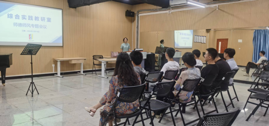 会议由综合实践教研室主任成幸雯老师担任本次会议的主持工作。她强调了师德师风在教师队伍建设中的关键作用,倡导教师们提升个人行为和言辞的规范性,推动课程思政全面育人的理念。同时,强调了在课堂排练中时间管理的重要性。随后,成老师向综合实践课的教师们详细说明了课程的演出安排,并建议任课教师根据音乐会的日程制定排练计划,有序开展排练工作。随后,针对本学期新增的流行音乐专场,成老师建议教师们积极鼓励学生参与节目申报和排练,以丰富学生的舞台经验。