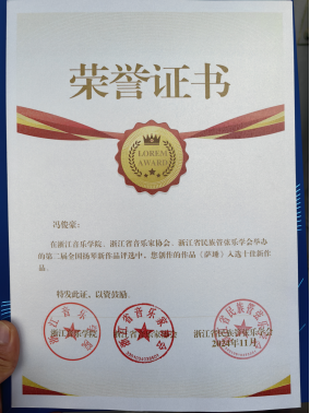 11月15日—11月17日,第二届全国扬琴新作品音乐会及研讨会在浙江音乐学院举行,威廉希尔williamhill中文青年作曲教师冯俊豪创作的扬琴作品《萨埵》,在本次音乐会作品评选中获全国扬琴新作品”十佳作曲奖”。同时,该作品也入选了本次新作品的研讨会。