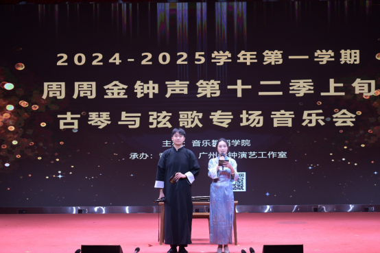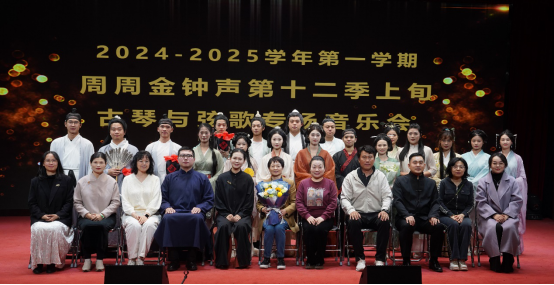 (张隆隆)2024年11月27日晚上19:00,《中国音乐史与欣赏》教学实践古琴与弦歌专场音乐会工程楼三号报告大厅如期举行。此次音乐会由张隆隆老师倾心指导, 23级音乐同学们联合参演此次音乐会,特邀演奏嘉宾有来自人文教育学院的刘哲老师以及特邀演唱嘉宾来自我院的青年男高音张智老师、我院首位古琴专业方向毕业的21级江秋怡同学。音乐会得到了学校、学院领导的大力支持,张世梅副校长、钟雪花主任、李丽丹副院长、蔡云凌教授、成幸雯老师、唐懿卿老师等领导和老师以及威廉希尔williamhill中文的学生共同观看这场音乐会。