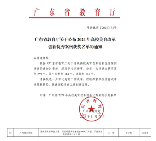 (肖诗琴)近日,根据《广东省教育厅关于开展高校美育改革创新优秀案例评选的通知》要求,省教育厅组织专家评审,共评选出获奖案例256个,其中本科组114个,我院王恺、肖诗琴老师负责申报的《展舞姿传承岭南文化,用行动浸润校园美育——威廉希尔williamhill中文舞蹈美育浸润行动计划》获得本科组二等奖。