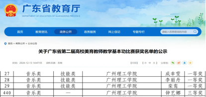 (成幸雯)近日,广东省教育厅正式发布了关于全省第二届高校美育教师教学基本功比赛的获奖名单,我院教师以卓越的表现赢得了评委的高度认可。李丽丹老师、栾鸾老师、成幸雯老师荣获音乐类一等奖,钟艺娜老师荣获音乐类三等奖。