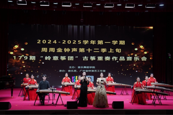 (金家玉)2024年12月18日,音乐系于工程楼三号报告大厅举办 “岭意筝团”古筝重奏作品音乐会,此次音乐会由喻娇老师和金家玉老师共同指导,21、22、23级古筝表演专业同学们联合参演。本场音乐会曲目丰富,精彩纷呈,充分展示了古筝音乐的独特魅力。