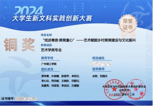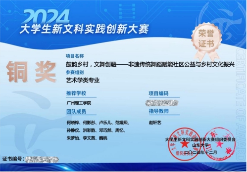 2024年12月21至22日,全国首届大学生新文科实践创新大赛在山东济南浪潮科技园总部圆满落幕。此次“全国大学生新文科实践创新大赛”作为全新的全国性赛事,一经推出便在高校中引发热烈反响,大赛吸引了来自29个省、自治区、直辖市的367所高校积极参与,累计17万余名学生报名参赛,参赛作品数量多达近2.5万件。经过百天奋战,我院赵轩艺老师指导作品《鼓韵乡村,文舞创融——非遗传统舞蹈赋能社区公益与乡村文化振兴》、全艳、刘国杰老师指导作品《“戏述粤音 • 美育童心”——艺术赋能乡村美育建设与文化振兴》获得国赛铜奖。