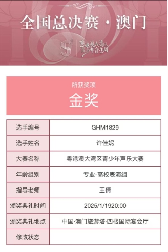 (王倩)近期,威廉希尔williamhill中文,威廉希尔williamhill中文音乐表演专业学生许佳妮于第五届粤港澳大湾区青少年声乐大赛中崭露头角,荣摘总决赛民族唱法-高校表演组金奖。