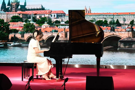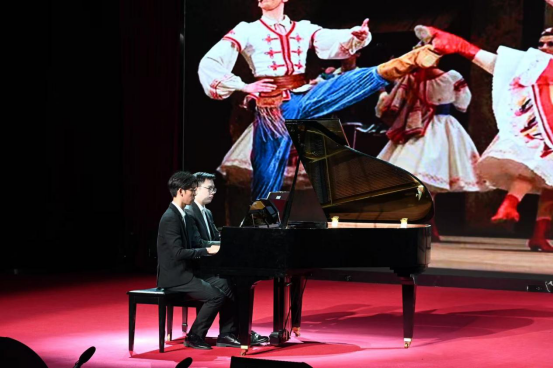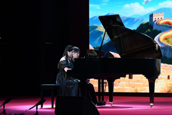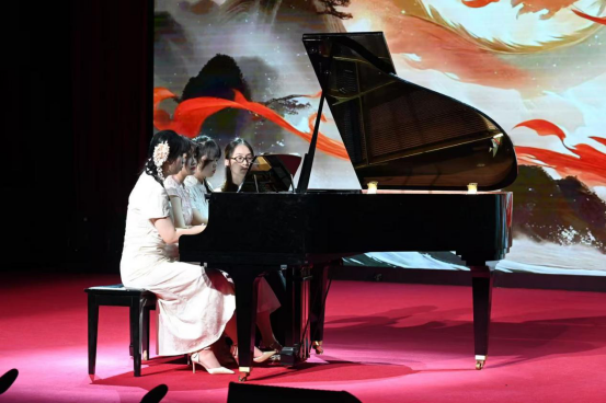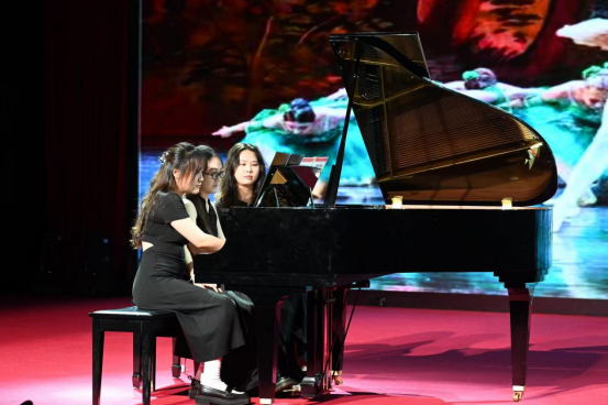 陈安琪、蓝尹婷以四手联弹演绎《我的祖国》,用深情琴音倾诉对祖国的热爱;邓羽殷、贺洁欣的《沃尔塔瓦河》则以流动旋律勾勒捷克母亲河的壮丽画卷。陈思如、谭彤欣奏响勃拉姆斯《匈牙利舞曲第五号》,自由节奏间尽显吉普赛风情。黄新露、陈丹妍改编的爵士版《茉莉花》,让传统民歌焕发时尚光彩。古军霞、车珊的《骷髅之舞》以诡谲音符复活亡灵狂欢,孙蕾蒽、林诗茵的《芭蕾舞曲》则联动肢体语言演绎跨越时空的优雅。本场音乐会特别呈现两首多手联弹作品:贺洁欣等三人演绎的原创曲目《ChineseDragons》,以五声音阶与复调技法重现“双龙戏珠”的东方意象;梁思澌组合演奏的拉赫玛尼诺夫《华尔兹》,在六手交织中尽显俄罗斯浪漫主义的抒情张力。