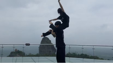 本次实践最具创新性与震撼力的环节,当属在霍山壮丽丹霞地貌间上演的户外实景演出。学生们以天地为幕,奇峰为景,将课堂所学技艺与霍山的自然人文景观深度融合。舞者身影灵动于山峦叠翠之中,刚柔并济的舞姿与雄浑古朴的丹霞赤壁交相辉映。这不仅是对学生环境适应力、即兴创作力与舞台表现力的综合考验,更是舞蹈艺术与自然景观、地域文化创新融合的突破性实践。
