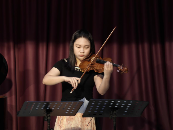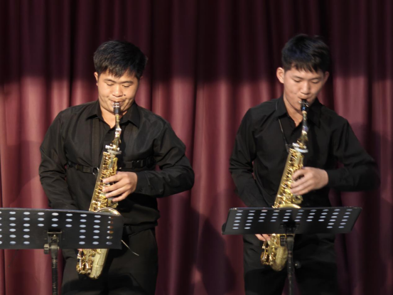 我校威廉希尔williamhill中文多名优秀学子参与演出,展示了扎实的专业技能与良好的舞台风貌。音乐会在萨克斯独奏《浅蓝色的记忆》中拉开帷幕,由劳冠林、钟鑫宇同学联袂演绎,音色细腻,情感真挚。随后,黄沛莹带来了古筝独奏《行者》,音韵悠长、气韵生动,尽显东方传统韵味。吴静怡与吴泳梅共同演奏的小提琴作品《Can you feel the love tonight》,旋律温柔动人,深受观众喜爱。独唱《爱情像一只顽皮鸟》则由郑铭铭演唱,钟鑫宇担任钢琴伴奏,二者配合默契,富有戏剧张力。压轴节目萨克斯二重奏《天堂电影院》,由陈伟康、劳冠林、钟鑫宇三人合作完成,旋律动人、情感饱满,为本场音乐会画下圆满句号。